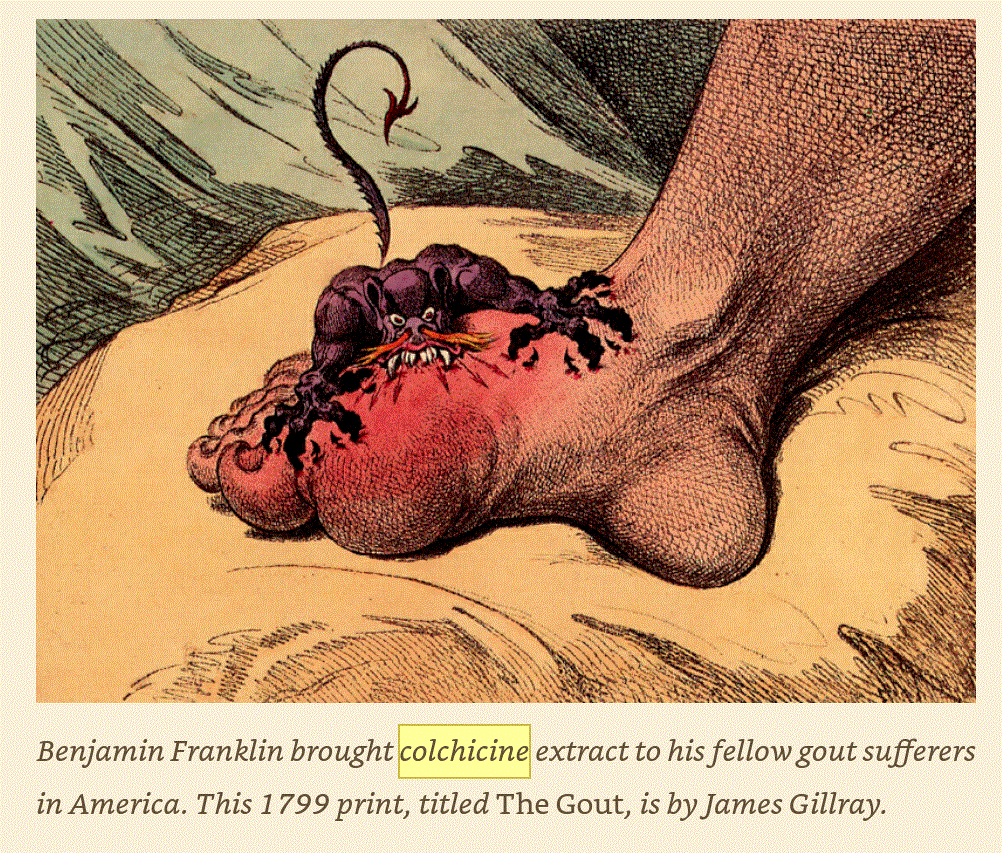Benjamin Franklin brought colchicine extract to his fellow gout sufferers in America. This 1799 print, titled The Gout, is by James Gillray.