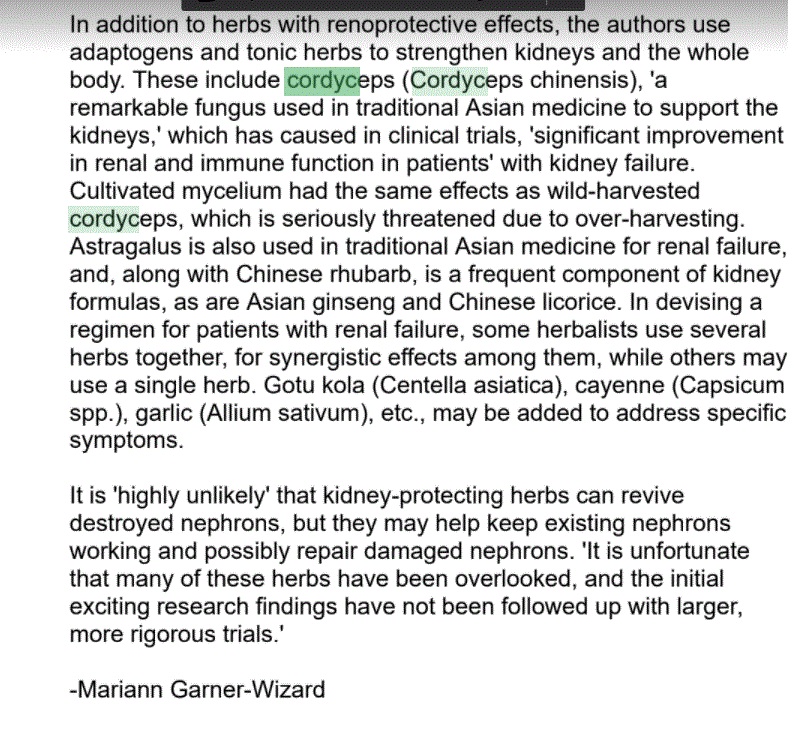 For many years I have been prescribing cordyceps [together with others, like Reishi and Rheum palmatum[Chinese Rhubarb] for chronic kidney failure. [see various attachments in this mail]
