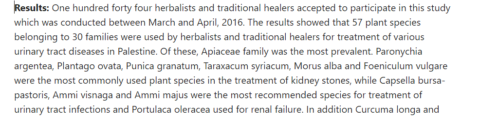 Of these, Apiaceae family was the most prevalent. Paronychia argentea, Plantago ovata, Punica granatum, Taraxacum syriacum, Morus alba and Foeniculum vulgare were the most commonly used plant species in the treatment of kidney stones, while Capsella bursa-pastoris, Ammi visnaga and Ammi majus were the most recommended species for treatment of urinary tract infections and Portulaca oleracea used for renal failure [the portulaca we use for Flu]