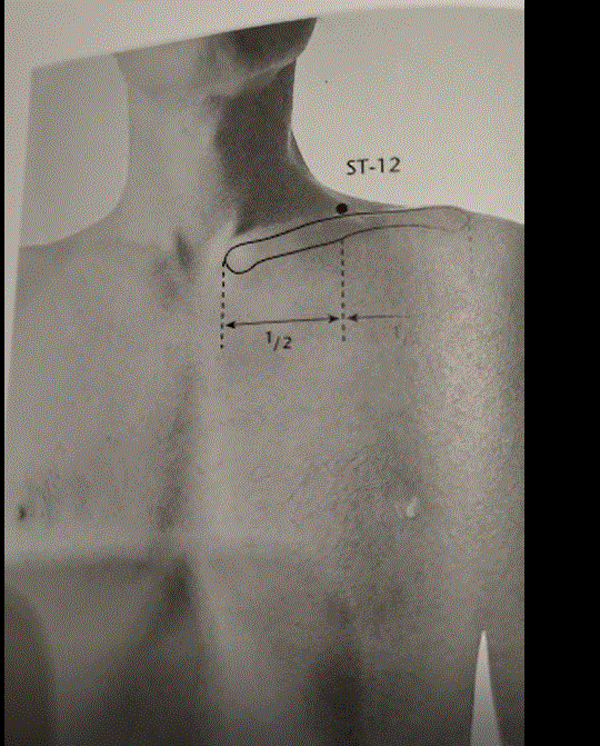 St 12 acupressure point, see picture: halfway the clavicula or for those of you with anatomical scholing: between the 2 heads of the cleidosterno mastoid muscle on the upperpart of the clavicila