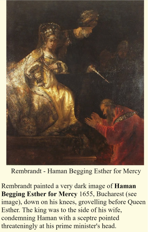 Painting: Rembrandt–Haman begging for mercy.